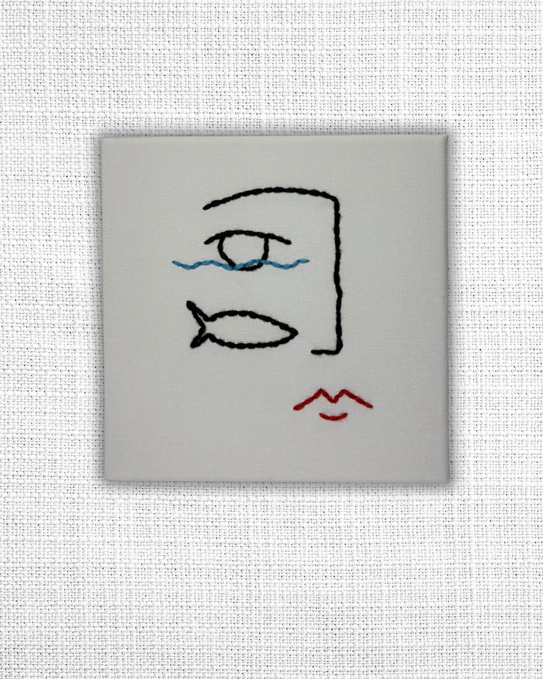 Un volto scomposto e ricomposto in frammenti poetici, dove mare e terra si incontrano nell'anatomia umana. L'occhio attraversato da un'onda blu suggerisce lacrime o oceani interiori, mentre il pesce nero nuota dove dovrebbe esserci un naso, simbolo di trasformazione e fluidità. Le labbra rosse in basso ancorano la composizione alla terra, alla passione, alla vita. Quest'opera minimalista esplora la natura frammentata dell'identità moderna - siamo contemporaneamente acqua e terra, animale e umano, completi e divisi. Un ricamo che invita a contemplare le molteplici nature che abitano in noi.