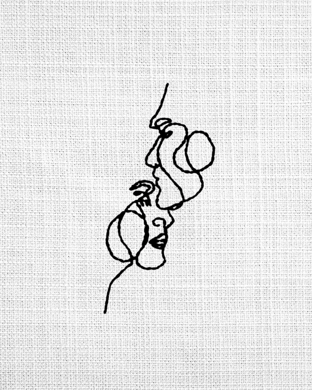 Un'opera che esplora l'intimità e la connessione umana attraverso linee essenziali. Due volti si fondono in un abbraccio visivo, dove gli sguardi si intrecciano e i confini dell'individualità sfumano. Il ricamo nero definisce i tratti mentre tocchi di rosso sulle labbra aggiungono passione e vita. Un'interpretazione moderna dell'amore e dell'unione, perfetta per chi ama l'arte contemporanea minimalista.